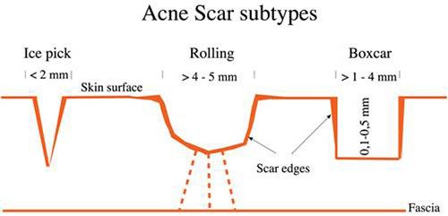 - ชนิด Ice pick scar (ระดับรุนแรงที่สุด) หลุมสิวระดับนี้จะเป็นหลุมลึก มีปากแคบ รักษาได้ยาก เพราะแนวหลุมเป็นไปในทางลึก ต้องใช้เวลานานในการรักษา