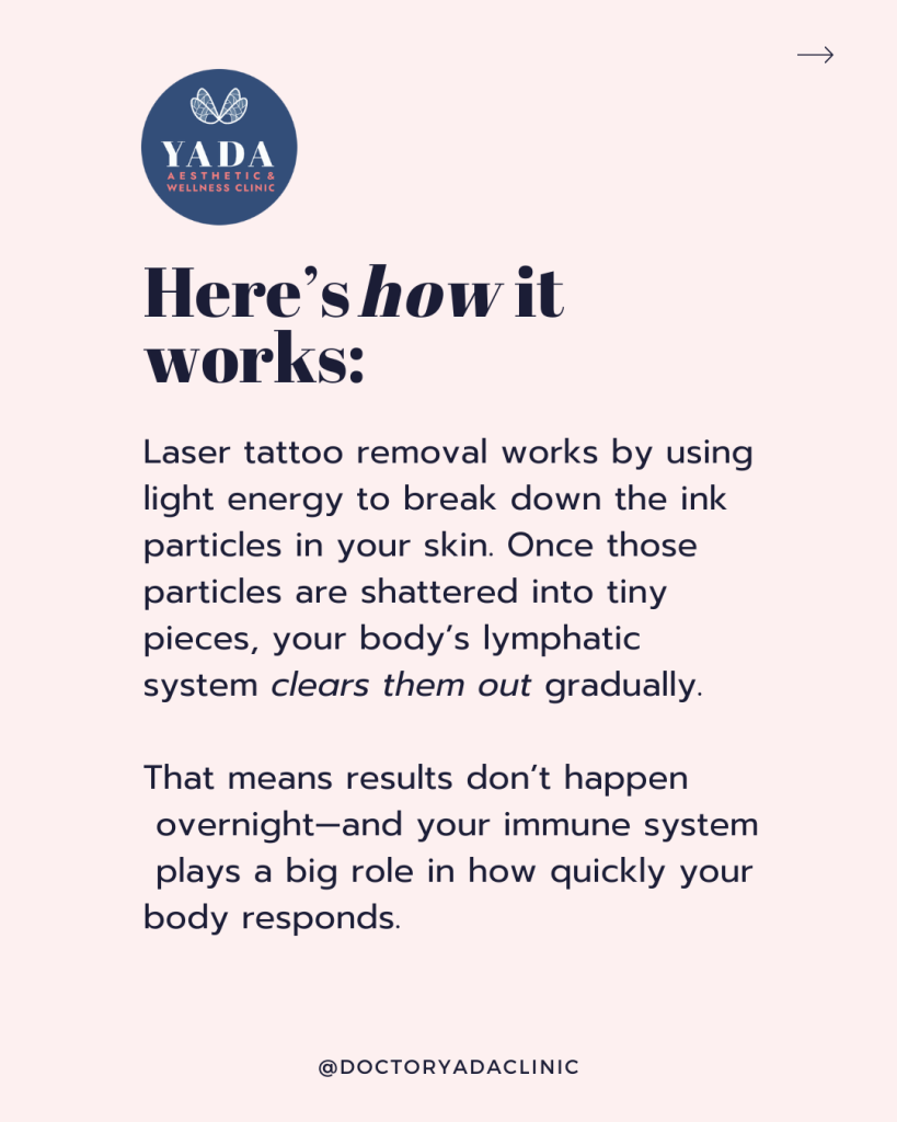 Using precise light energy, the laser breaks down tattoo pigments into smaller particles, allowing your body’s natural processes—led by your lymphatic system—to safely clear them away.